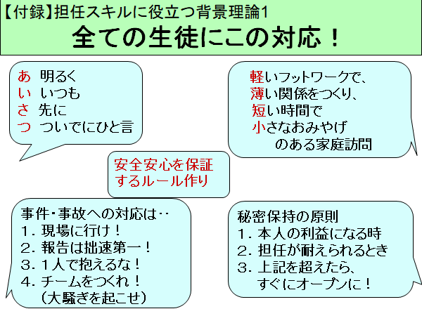 まずは「1 全ての生徒にこの対応」のスライドです。どんなタイプの生徒にも、その時の生徒たちの状態にも関係なく、この基本スタイルで接しておこうということです。この基本態度をもっていないと、毎日の担任としての姿勢を整えることができません。明日以降、少しずつ説明します。[この項続く]